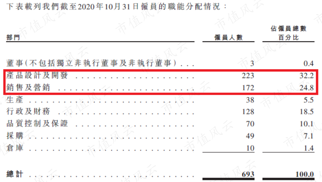 实际上,公司从事产品设计及开发的人员是最多的,其占总员工人数的比例接近三分之一,其次就是销售团队。