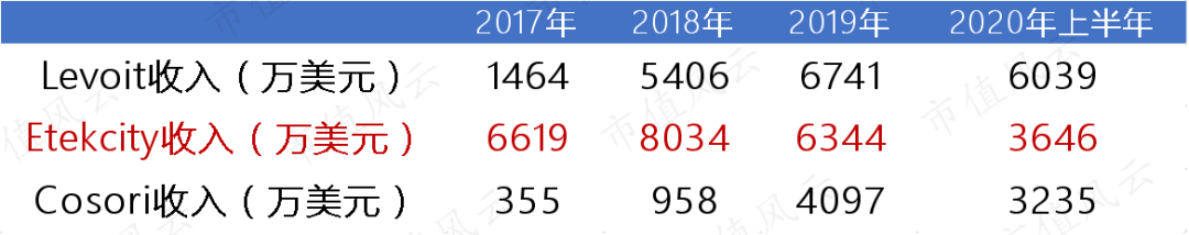 Etekcity品牌收入在2017、2018年分别达到6619万美元、8034万美元,彼时的Etekcity还是公司收入最高的品牌,在2019年,被Levoit超越,按照目前的变化趋势,Etekcity有可能也会被Cosori超越。