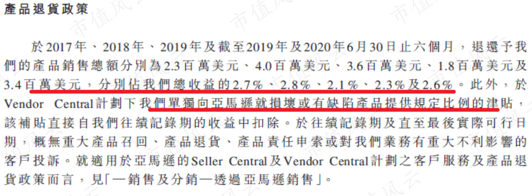 另外,公司与亚马逊之间会签订类似产品退货的协议,交付给亚马逊的产品如果是有损坏或者有缺陷,那么公司就必须给予亚马逊一定的补偿。