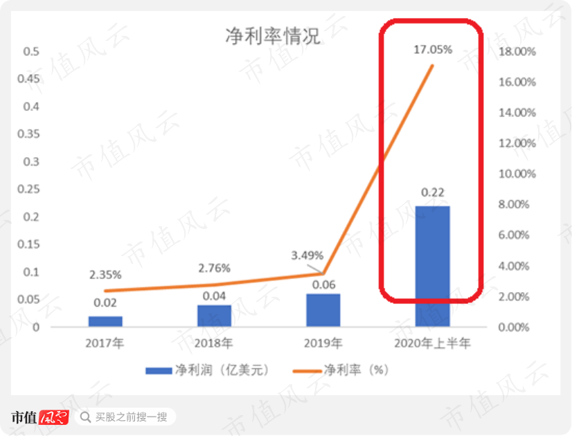 现在我们来细看一下2020年上半年的情况。今年上半年有疫情的情况下,Vesync的净利润竟然大幅增加至0.22亿美元,净利率也暴增至17.05%。
