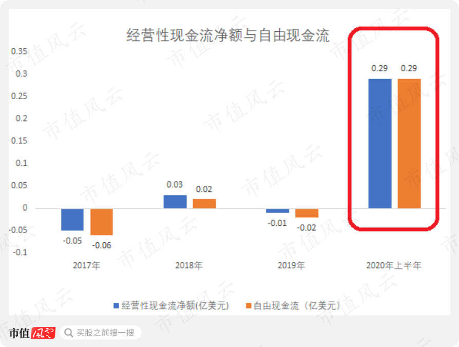 受疫情这个利好因素的影响,今年上半年,经营性现金流净额和自由现金流大幅增加到0.29亿美元。