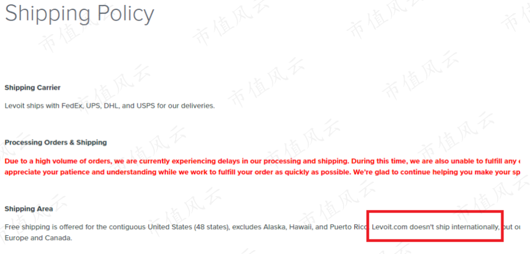 下图显示的是Levoit的官方网站的购物指南,里面明确提到“Levoit.com doesn't ship internationally”,即公司不会将已下单的商品运送到国外,这里的国外指的不是中国以外,而是美国以外,也就是说,官方的线上渠道只针对美国地区的消费者。