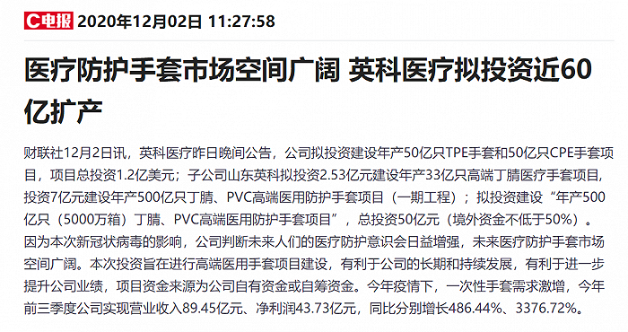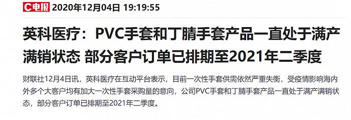 12月4日,英科医疗在互动平台表示,目前一次性手套供需依然严重失衡,受疫情影响海内外多个大客户均有加大一次性手套采购量的意向,公司PVC手套和丁腈手套产品一直处于满产满销状态,部分客户订单已排期至2021年二季度。