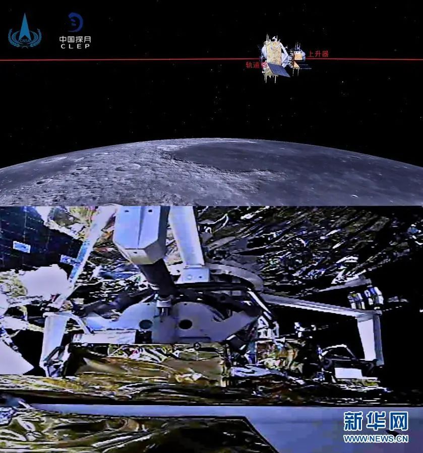 嫦娥五号上升器与轨道器返回器组合体完成交会对接画面。