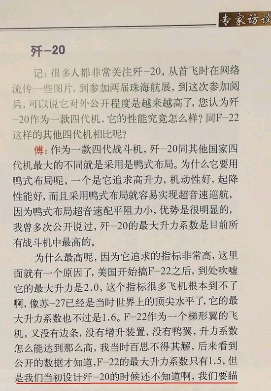 后来他们才发现,美国人在吹牛,F-22的升力系数只有1.5。但是,在设计歼-20的时候他们还不知道真实数据,就把美国人吹的牛当真了。结果,歼-20的升力系数就拉到了2.0以上……