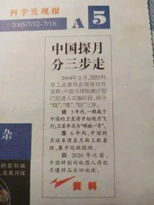 结果,有网友找到了一期2005年的《科学发现报》,在这期报纸的角落,刊登了中国在2004年2月制定的月球探测计划,分为“绕”、“落”、“回”三个阶段: