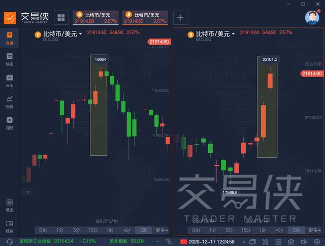 在发文前,比特币还一度涨至22000美元上方,现在很多人关心的问题是,比特币到顶了吗?这两天比特币的日线图和2017年暴跌前有点相似,如下图所示,2017年(左)比特币在创下历史新高的时候出现了跳空高开的行情,昨天(右)比特币突破20000美元大关后,今天也是跳空高开了。