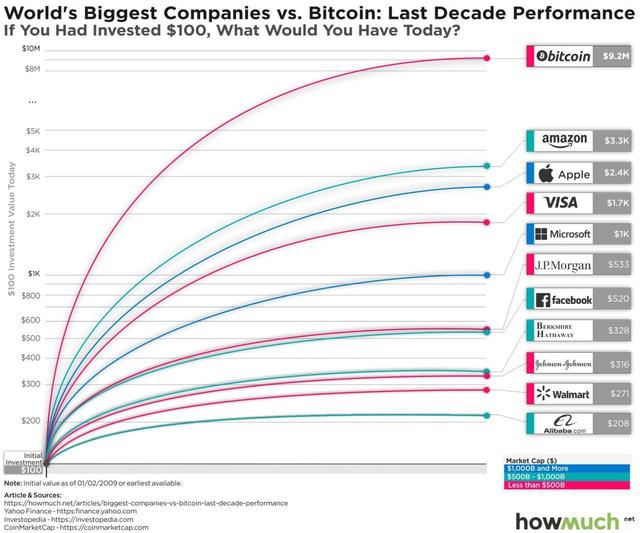 我们再来看一张图。过去十年,美国科技股的表现有目共睹,它们也是美股牛市的主力军。然而,即便是过去10年增长最疯狂的美国科技巨头,其增长速度也比不上比特币。