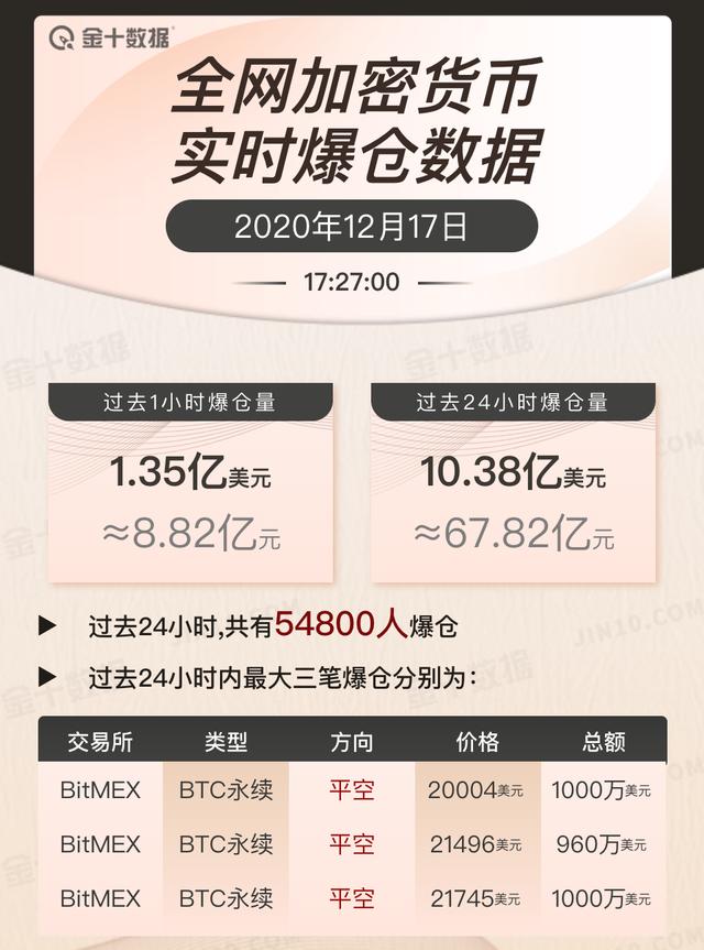 全网加密货币实施爆仓数据显示,截至17:27,过去一小时的爆仓量达到8.82亿元,过去24小时的爆仓量达到67.82亿元。