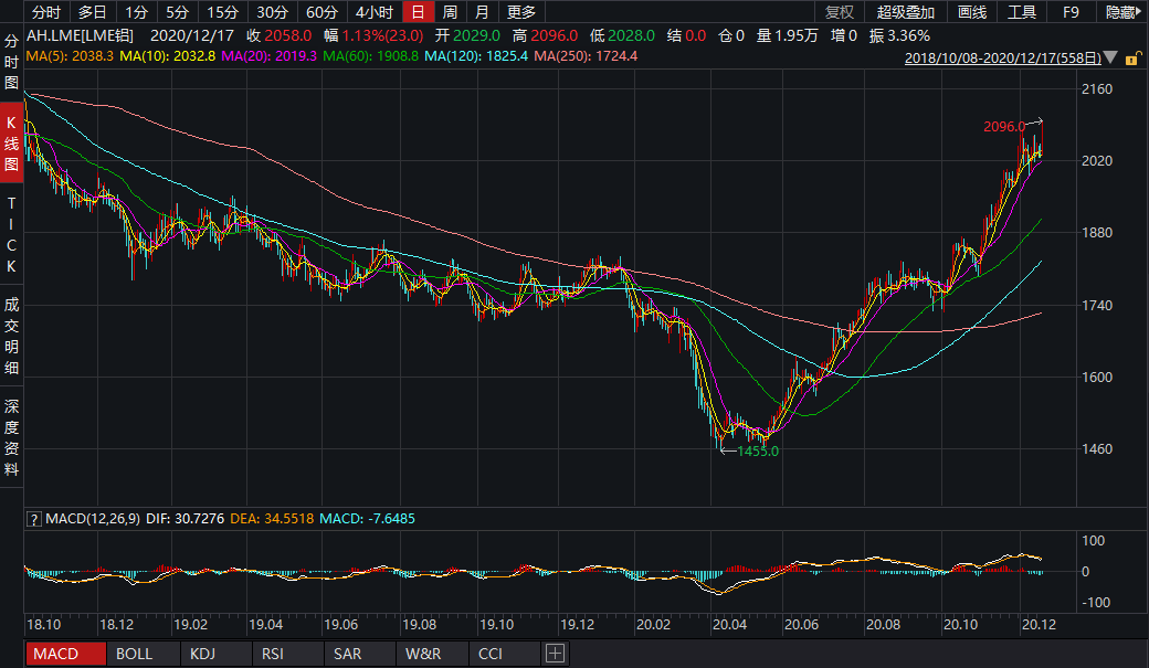 LME期铝周四刷新2018年10月以来最高水平,一度涨至2096美元/吨,截至发稿仍涨逾1%。