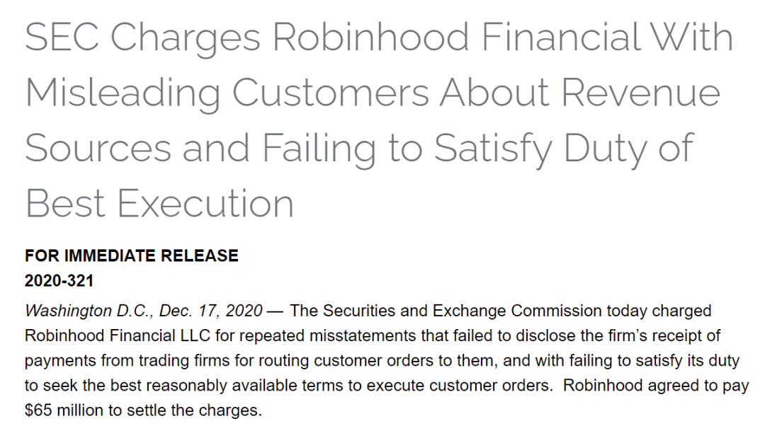 根据SEC陈述,自2015年至2018年末,Robinhood在客户沟通中出现误导性陈述和遗漏,未能披露公司营收的最大来源是“订单流支付”,即交易公司付款以换取Robinhood将其客户订单发送给这些公司执行。Robinhood甚至在官网的F&Q上也未能体现这一情况。