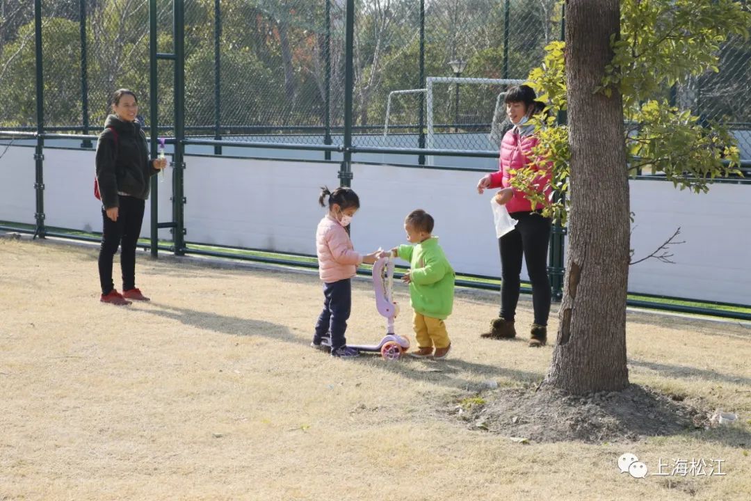 方松体育公园东靠通跃路,西抵嘉松南路,南临新松江路,北至文翔路,总面积52991平方米,内建有800米的环形绿道、运动场、流水元素的樱花溪谷、阳光草坪等,是集休闲游憩、运动健身于一体的生态型休闲绿地。虽然已是冬季,室外温度较低,还是有不少市民在绿道上行走,在草坪上嬉戏,在亲水平台处锻炼健身。