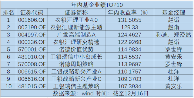 Wind最新数据显示,截至12月16日,农银汇理工业4.0以高达131.51%的年内收益率暂居业绩榜首位,而农银汇理新能源主题、广发高端制造A、农银汇理研究精选则分别以129.33%、124.46%、122.93%的年内收益率紧随其后。