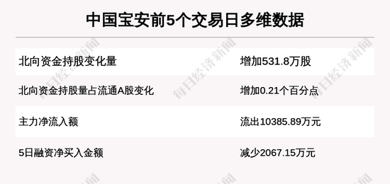 截至12月17日的5个交易日,中国宝安的北向资金持股增加531.8万股,北向资金持股量占流通A股增加0.21个百分点,主力净流出额10385.89万元,5日融资净买入金额减少2067.15万元。