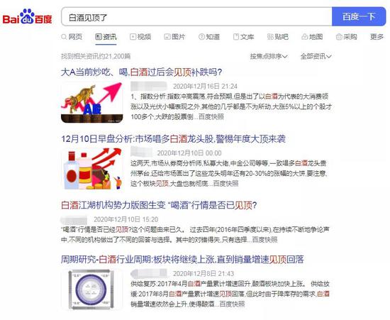 在百度上随手一搜,排名靠前的就有不少相关消息。牛眼君(每经牛眼:njcjnews)大致翻看了一下,大多是从“抱团”“吸引资金炒作”“补跌”等角度来分析,似乎说服力还不够强。况且,关于“白酒股见顶”的说法早在去年就不断出现在各种媒体之上,不过后来都统统被“打脸”。白酒股还能涨多久?相信没几个人敢作出明确的预测,包括牛眼君(每经牛眼:njcjnews)在内也是如此。
