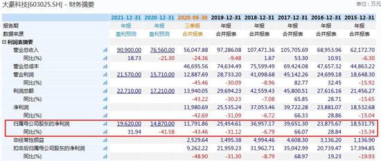 当然,赚钱才是大豪科技收购红星二锅头的最终目的。数据显示,大豪科技的业绩连年处于颓势:自2018年年报归母净利润同比下滑6.79%之后,2019年年报归母净利润同比明显下滑31%;今年三季报合并归母净利润同比更是下滑超过43%,今年机构预测归母净利润同比将下滑41%。
