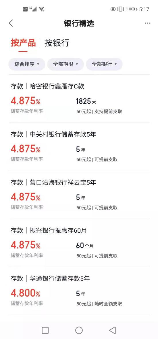 ➢支付宝合作6款产品。在其在售银行存款产品中,其中年化利率最高为4.80%,是由天府银行提供的五年定期产品。
