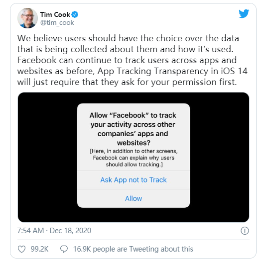 库克发推文回应了两家公司现在广为人知的这场隐私之争,“Facebook可以像以前一样,继续通过应用和网站追踪用户”。库克继续说,问题是,苹果现在只是要迫使Facebook获得人们的明确许可,才能做这种事情。