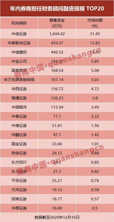 华泰联合证券和中信建投证券年内担任财务顾问的规模均超400亿元,市场份额均超13%。这3家券商合计占据的市场份额超过58%。