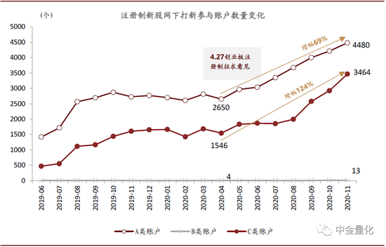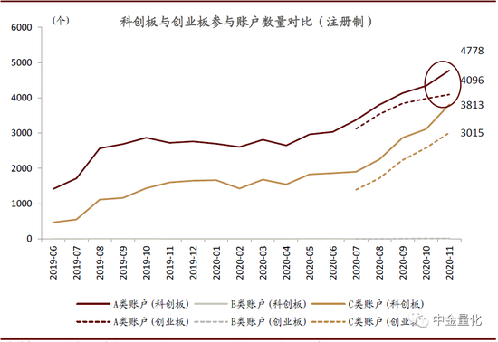 具体来看注册制打新账户数量:C类账户较2019年底翻了一倍。事实上,2019年四季度至2020年一季度,注册制网下打新账户数量基本没有太大波动,随着4月27日创业板试点注册制开始征求意见,三类账户的数量便逐月攀升,C类账户由于成立时间相对较短,数量增幅最为显著。截至2020年11月底,A类账户数量相较于4月底增加69%,而C类账户数量同期增幅达到124%,账户数量的激增很可能对中签率造成直接的冲击。此外,虽然同为注册制,创业板与科创板打新参与账户数量仍存在近1500个左右的差距。