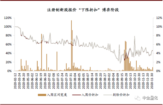 赚钱效应引发市场化定价报价博弈模式演变,入围价基本稳定在下限折扣50%附近。市场化定价机制下,投价报告提供的价格区间成为网下参与投资者报价博弈的关键信息,现阶段丰厚的打新收益促使投资者普遍以“中签”为目标,新股发行价持续下行,机构报价模式也经历了从投价报告“区间分位数”到“下限折扣”的变化。2020年2月中下旬以来,注册制新股入围价格已跌破投价报告下限,进入“下限折扣”模式后低价发行情况依然持续,注册制新股最终定价一度跌落至20%下限折扣。9月份上纬新材IPO之际,超九成配售对象报价统一为2.49元引起监管关注。9月21日,上海证券交易所自律委召开了第八次工作会议并对近期新股发行过程中出现的新情况发布了行业倡导,建议各机构委员自查内部合规管理。为进一步规范投资者参与询价申购行为,中国证券业协会于11月下发通知规范网下打新询价日管控相关人员通信设备。在监管进一步规范网下投资者询价行为的背景下,注册制新股入围价格也逐渐回归理性,近期基本稳定在40%~50%下限折扣附近。