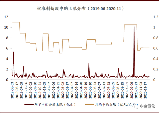 整体分布:2020年以来,注册制新股网下询价申购上限显著提升,对于参与网下打新的账户来说,一定程度上缩小了大规模账户与小规模账户之间的收益率差距,但同时也增加了报价过程中小规模账户被高价剔除的风险。截至2020年11月底,注册制新股年内平均申购上限达3.8亿元,显著高于2019年平均水平(1.5亿元);核准制新股年内平均申购上限达0.72亿元,与2019年平均水平基本相当。