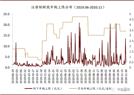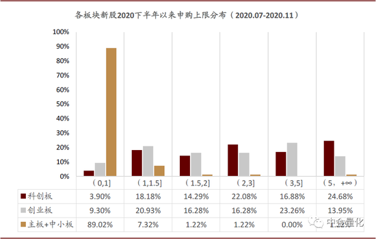 图表:2020年下半年注册制与核准制新股申购上限分布分化较大
