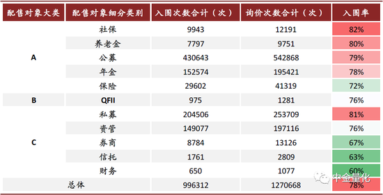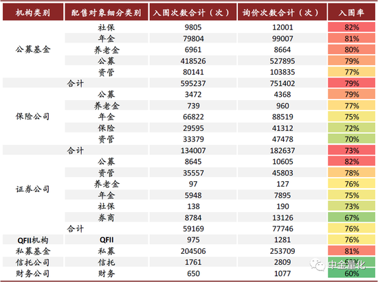 机构入围率:从报价机构大类来看,私募基金打新入围率最高,整体达到81%;其次是公募基金,同样也达到了79%;而相比之下保险公司(73%)、证券公司(76%)及QFII机构(76%)的入围率稍逊一筹。
