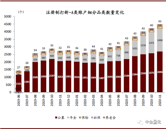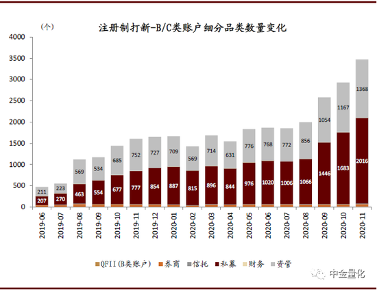 进一步,从A/B/C三类账户细分品类来看,年金、资管、私募产品增量最高。1)A类账户中,数量扩张最快的是年金产品,从2019年底的400多个快速增加至2020年11月30日的近1500个,增幅高达240%;而公募产品由于发审过程较为漫长,同期账户数量仅增加了600多个,增幅接近30%;但值得关注的是,网下打新不仅为公募产品贡献了大量超额收益,同时也提升了固收+产品的市场关注度和规模增长,2020年以来固收+基金的宣传几乎都涉及到打新策略的应用。2)C类账户中,资管产品与私募产品数量扩张较快,相较于2019年低增幅分别达到88%和136%。