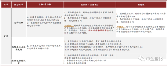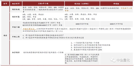 图表:A股市场各板块网下配售制度对比,询价环节:注册制网下配售对象剔除个人与一般法人,可报三个价格