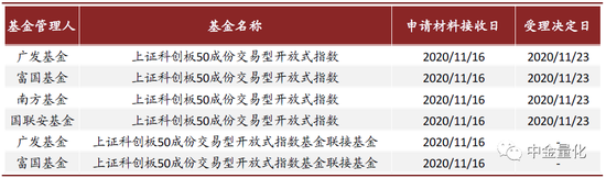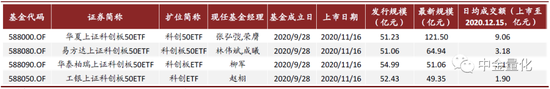 首批科创板50ETF上市成交活跃,华夏上证科创板50ETF规模已突破百亿元。继科创50指数宣布将发布之后,2020年7月15日,易方达、华泰柏瑞、工银瑞信、华夏四家基金公司率先申报了跟踪科创50指数的ETF产品;9月28日,首批四只科创板50ETF产品正式成立,合计募集规模达到209.70亿元;从申报到上市历时4个月,首批四只科创板50ETF 11月16日上市以来成交活跃。其中,规模最大的华夏上证科创板50ETF上市以来规模已经翻倍,近1个月日均成交额达到9.06亿元,高于同期的创业板ETF成交情况,流动性略低于上证50、沪深300、中证500的规模最大的ETF。值得关注的是,科创板50ETF仍有不少基金公司在积极申报,从证监会行政审批明细来看,广发、南方、富国、国联安等公司均在列。