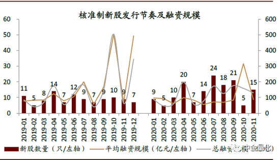 2020年创业板注册制落地后,新股发行节奏显著提升,融资规模也快速累积。截至2020年11月底,A股市场共发行新股355只,合计融资规模达到4110亿元(含网上定价发行新股),依此年化计算,我们预计今年全年A股融资规模有望达到4500亿元;从结构上来看,注册制新股占据了65%以上的融资规模,科创板和创业板已成为IPO主要的融资市场。尽管对创业板进行了注册制改革,并未对核准制形成挤出效应,相较于2019年,核准制新股的发行节奏及融资规模也均有提升。而注册制新股在今年7、8月经历了发行高峰之后,发行节奏也逐渐趋于常态化,发行新股数量在20只附近。