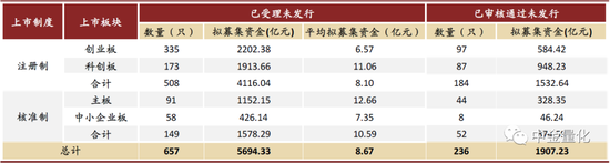 IPO项目储备充足,各板块已受理未发行项目超过600个,我们预计A股融资规模超过5000亿元。截至2020年12月10日,注册制与核准制已审核通过待发行项目已达到236个,合计拟募集资金总额超过1900亿元,其中,注册制新股占比接近80%,打新收益供给端水源充足。