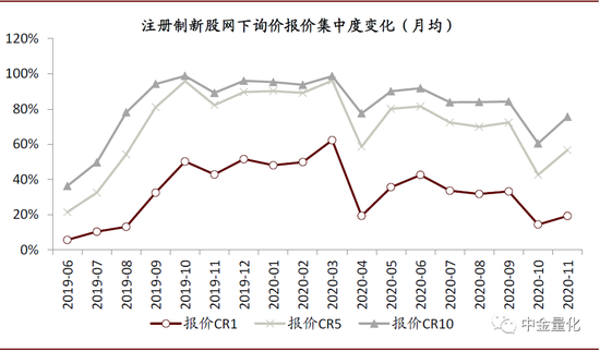 报价模式演变不仅体现在定价持续下行,同时报价集中度也经历了从低高的过程。科创板首批新股询价之时,网下参与机构尚有近200个不同报价,而现阶段单只新股不同报价数量基本稳定在80~100左右。我们类比行业研究中常用的市场集中度计量指标CR(Concentration Ratio)来衡量网下报价的集中程度,截至2020年11月,CR1达到19%,说明第一大报价对应询价对象数量占所有询价对象数量比例达19%;CR5达到57%,即前五大报价对应的询价对象数量占比已超过50%。从CR数据的变化趋势来看,目前注册制新股网下询价仍处于集中度较高的阶段。