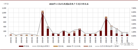 网下打新收益时间维度分布不均,存在一定的事件集聚效应。为了使打新收益更具纵向可比性,我们以2亿元规模的A类账户为例计算单账户打新收益,2019年以来月度打新收益分别在2019年7月和2020年7月出现了小高峰(金麒麟分析师)。观察下图可以发现几个结论: