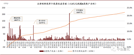 仍然以2亿元规模A类账户为例,我们统计了注册制以来的所有新股个股收益贡献,中芯国际、澜起科技、金山办公、晶晨股份、柏楚电子、中国通号、中微公司7只股票已经贡献了20%的收益。因此,在实际参与网下打新的过程中,打中每只新股的重要程度并不一样,对于融资规模大、市场关注度高的新股需格外关注和谨慎。