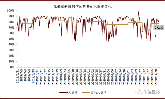 个股网下入围率:该指标主要衡量网下参与打新账户的整体报价能力,2020年以来由于报价模式转变,新的参与者涌入,机构间博弈更加激烈,网下打新整体报价能力较2019年有所降低,并在创业板注册制推出初期和10月中下旬经历了两次大幅回调,近期已逐渐回升至77%。