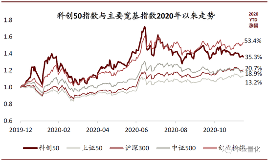 图表:科创50指数2020年前三季度表现强劲,四季度以来表现相对疲软