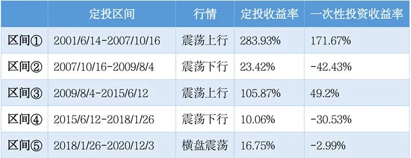当前市场行情较为震荡,多位业内人士建议,对于普通投资者而言,定投是一个较佳方式。以上证指数为投资标的,每月定投1000元,不论是震荡上行、震荡下行或横盘震荡市场,定投的优势都相对更明显,收益都比一次性投资收益要高。