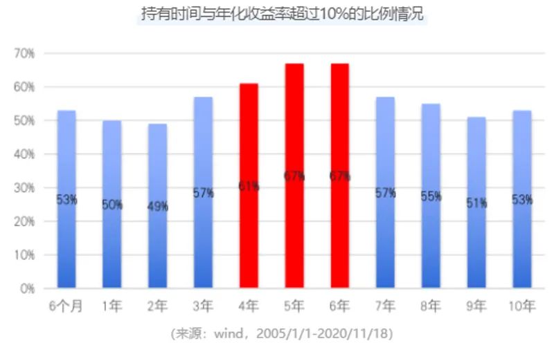 中欧基金测算发现,对于偏股型基金,持有五年效果最佳。以偏股混合型基金指数为例,持有半年到两年,获得年化收益率超过10%的比例相对较低;但持有时间在4-6年的时候,年化收益率超10%的概率是最高的,最高达到67%;如果再拉长持有时间,坚持持有7-10年,该概率下降,与短期持有的获胜概率差不多。