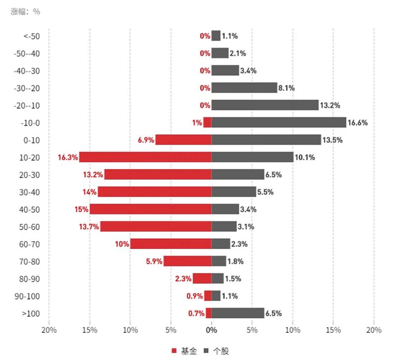具体来看,基金年内收益主要集中在10%-70%之间,占比89.11%;而个股的涨幅则相对分散,主要集中在-20%-40%区间,占比65.52%。
