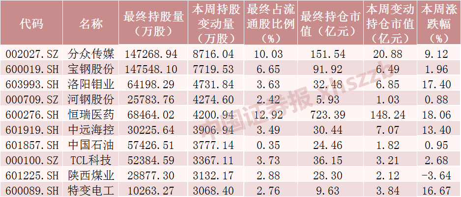 本周北向资金持仓市值增加额居前十个股