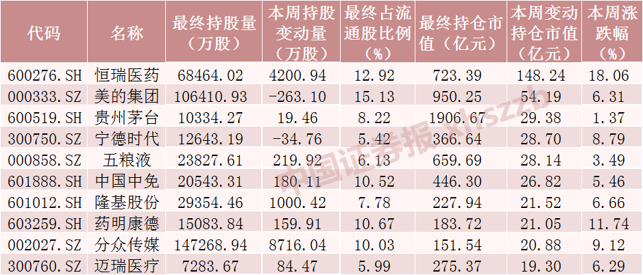 本周北向资金加仓股数居前十个股