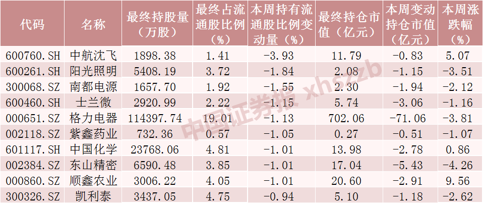 本周北向资金减仓股数居前十个股