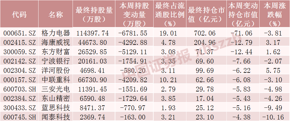 本周北向资金持仓市值减少额居前十个股