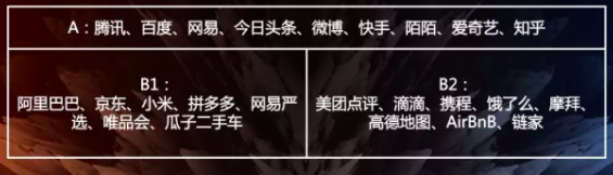 A、B1、B2三个不同的特征,其实塑造了对应企业的核心能力。从时间轴上来看,A是最早出现的互联网产品例如门户网站,接着是B1,比如电商网站,直到2010年随着智能手机的普及,B2类型的公司和产品才得以涌现。