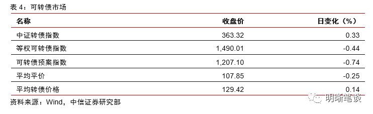 12月18日转债市场,中证转债指数收于363.32点,日上涨0.33%,等权可转债指数收于1,490.01点,日下跌0.44%,可转债预案指数收于1,207.10点,日下跌0.74%;平均平价为107.85元,日下跌0.25%,平均转债价格为129.42元,日上涨0.14%。320支上市交易可转债(辉丰转债除外),除比音转债和白电转债横盘外,165支上涨,153支下跌。其中永兴转债(14.03%)、凌钢转债(7.66%)和赣锋转债(7.14%)领涨,花王转债(-8.37%)、汽模转2(-7.93%)和海大转债(-4.26%)领跌。317支可转债正股(*ST辉丰除外),除华体科技、三祥新材、白云电器、英联股份、九洲集团、光华科技、中化岩土、双环传动和航天信息横盘外,98支上涨,210支下跌。其中永兴材料(9.99%)、凌钢股份(9.91%)和璞泰来(8.13%)领涨,花王股份(-9.09%)、华海药业(-6.96%)和艾华集团(-6.69%)领跌。