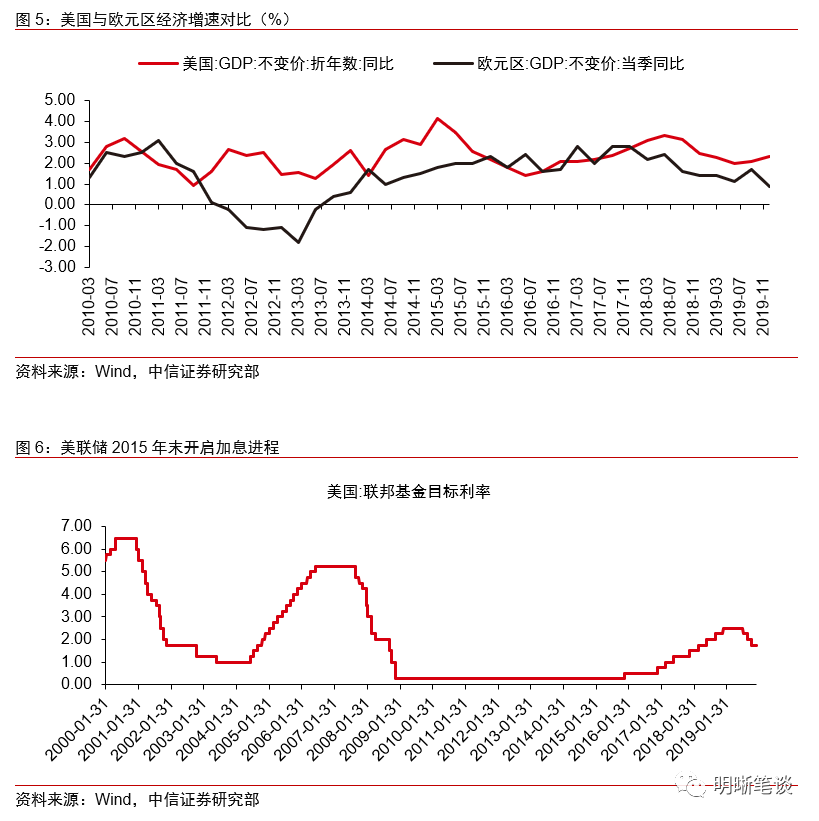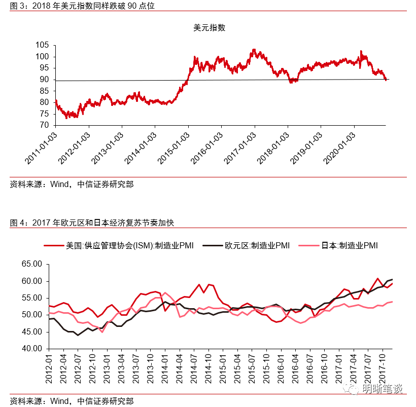 放大观察第三轮美元大周期,上一次美元指数跌破90关口发生在2018年初,从原因上来看当时美元指数大幅下跌的主要原因在于全球主要经济体复苏节奏由美国领先转为同步复苏,同时在经济修复的背景下如欧元区等主要经济体货币正常化脚步加快,增速差和政策差的收敛带动美元指数大幅走弱。放大观察第三轮美元大周期,我们可以发现上一次美元指数跌破90关口发生在2018年的1月份。回顾当时美元指数大幅下跌的情况,从大的趋势上来看,美元指数的走弱实际上开始于2017年初,而在下跌开始之前美元指数的走升发生在在当时全球经济整体处于经济复苏阶段的背景下。相较欧元区和日本经济景气恢复情况,2014年美国经济率先开始复苏进程,制造业PMI一度上升至59%,虽然后续美国制造业PMI指数经历了高点回落,但相较欧元区和日本PMI指数的始终处于荣枯值附近,美国经济恢复具有领先特征,美国GDP同比增速显著高于欧元区,美联储也在2015年年末率先启动了加息进程,因此在增速差和政策差的推动之下,2016年美元指数出现了大幅走强。时间进入到2017年,欧元区和日本经济复苏加速,欧元区和日本制造业PMI持续走高,全球主要经济体复苏节奏由美国领先转为同步复苏,与此同时在经济转好的前景之下,欧央行在2017年4月将每月购债规模由900亿欧元下调至600亿欧元,而2018年1月起更是缩减至300亿欧元,欧元区货币政策正常化的脚步有所加快,因此在2017年我们可以看到增速差和政策差收敛导致了当时美元指数的持续走低,2018年1月24日更是直接跌破了90关口。