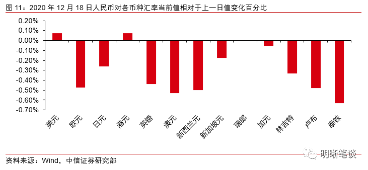 虽然目前美元指数已跌破了90的心理关口,且短期来看仍有持续走弱的压力,但我们认为明年下半年可能得益于货币政策和基本面因素的变化,美元指数或将得到一定的支撑,届时相对于弱美元而表现强势的人民币升值动力或将有所减弱。目前美国大选基本尘埃落定,疫苗的广泛接种也透露曙光,在前文关于美元指数后续走势的判断之下,尽管短期内美国的经济基本面仍存在一定的不确定因素,美元指数仍有下探的可能。但展望明年,下半年美国经济可能进入复苏企稳以及通胀等因素可能带来的美联储货币政策边际收敛,届时相对于弱美元而表现强势的人民币升值动力可能也会有所减弱。