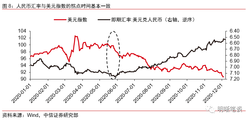 美元走势对人民币汇率的影响:从今年年中开始的人民币升值的主要原因或为同时期美元的相对走弱,对于后续美元指数走势的判断,我们认为在美国疫情仍旧严峻以及新一轮财政刺激推出后美联储货币政策可能进一步宽松的预期下,明年上半年美元指数或仍将维持弱势,美元指数存在进一步下探的可能。进入明年下半年随着美国经济可能进入复苏企稳以及通胀等因素可能带来的美联储货币政策边际收敛,美国或扮演2017年欧元区的角色,美元指数或迎来企稳反弹,届时相对于弱美元而表现强势的人民币升值动力或将有所减弱。